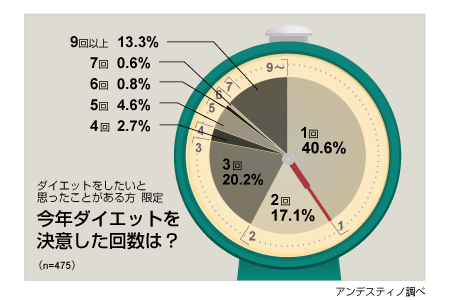 今年の“ダイエット決意の回数”は「1回(40.6%)」が最多だが、「9回以上」決心している人が13.3%( ゚д゚ )