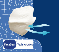 アメリカの国立労働安全衛生研究所のN99基準をクリア、最高レベルの防御性能最先端のフェイスシールテクノロジーを採用し、ゴムバンドを必要とせず、顔・鼻の周囲全面にしっかりと密着、吸気・排気漏れをしっかりと防ぐことができるそうです。